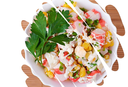 Пекинский салат, крабовое мясо, огурцы свежие, кукуруза, лук репчатый, яйцо отварное, креветка обжаренная во фритюре, майонез, соль, перец.